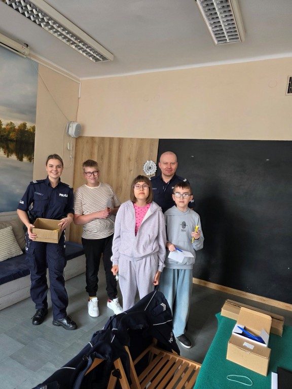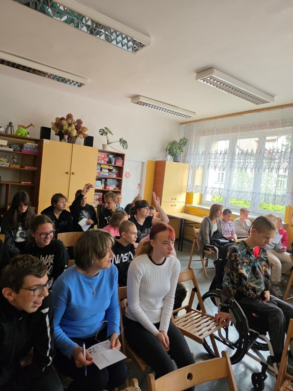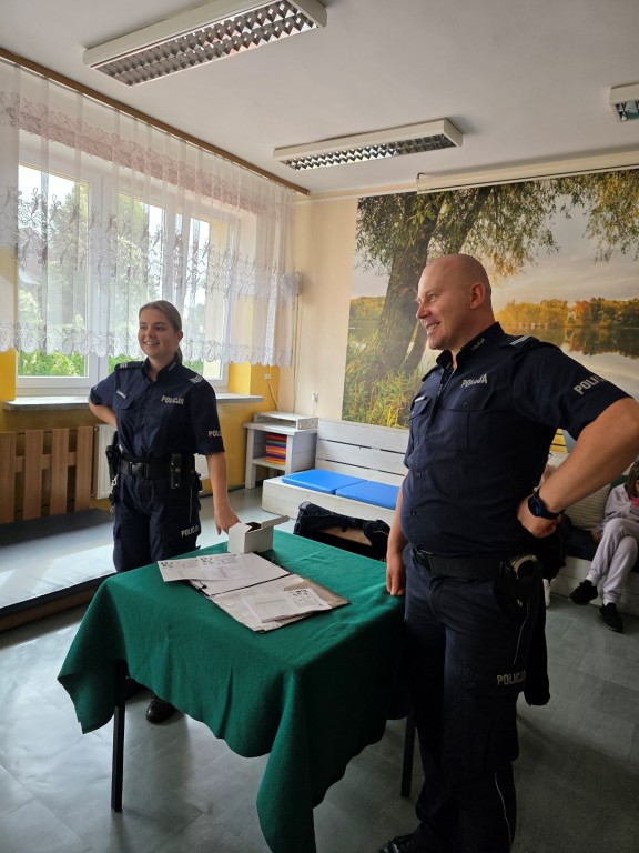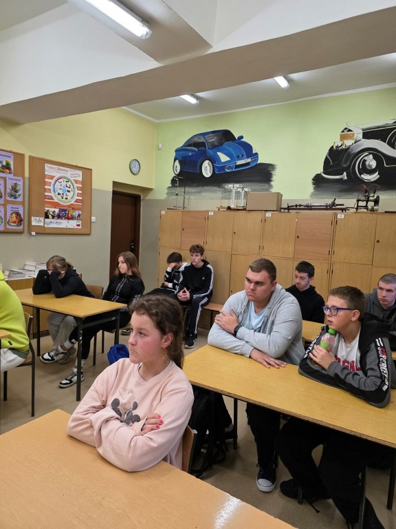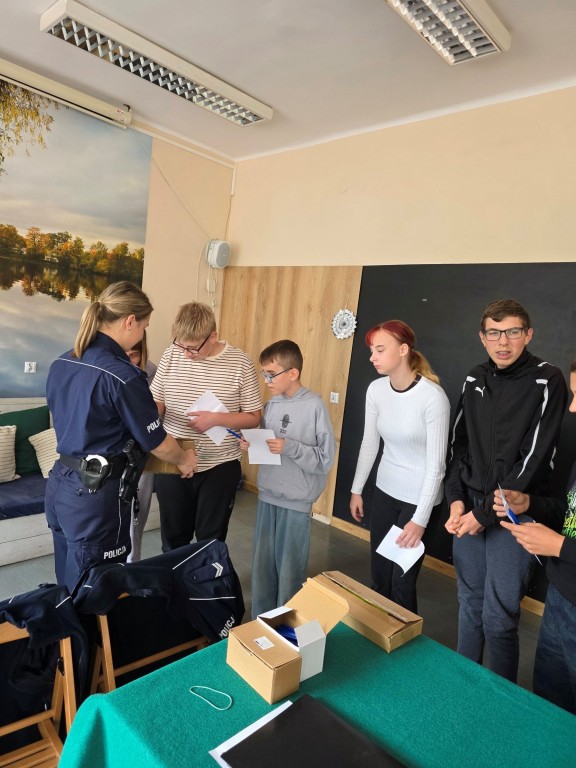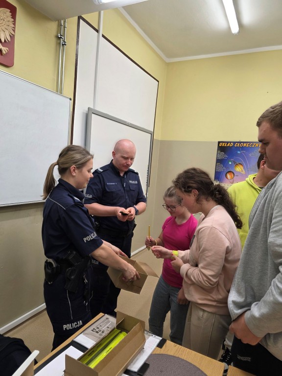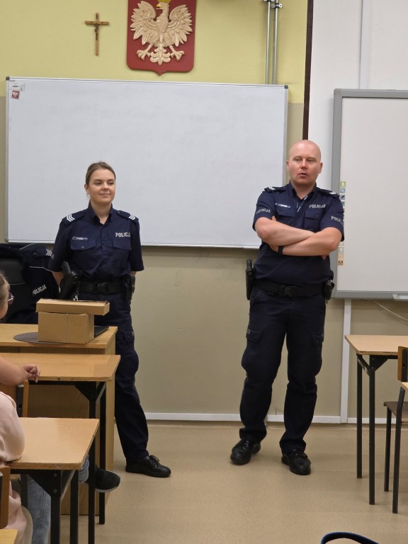 W dniu 17 września 2025r. uczniowie Szkoły Podstawowej Nr 9 i Branżowej Szkoły I stopnia uczestniczyli w szkoleniu prowadzonym przez przedstawicieli Komendy Powiatowej Policji w Chrzanowie P. Kingę Korbel i P. Grzegorza Martensa.
