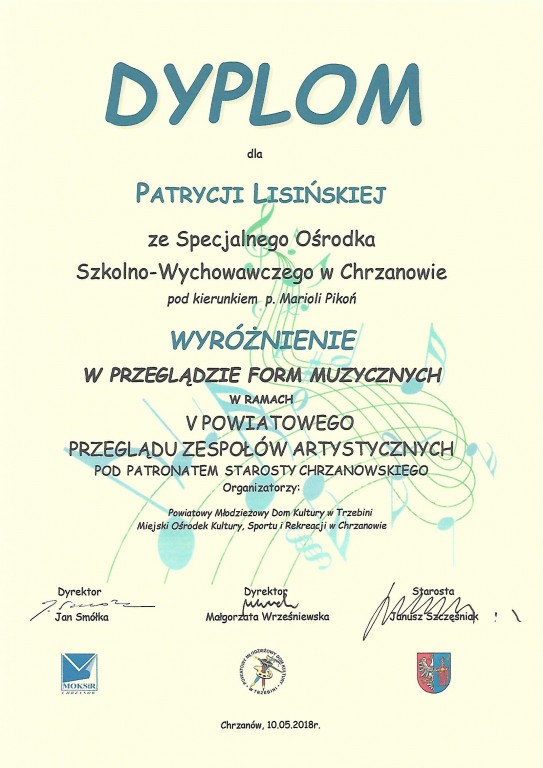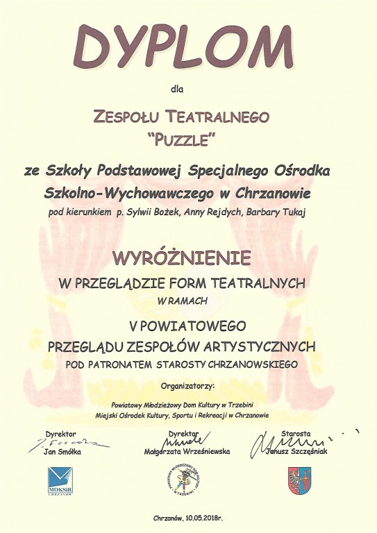 Uczniowie Specjalnego Ośrodka Szkolno-Wychowawczego w Chrzanowie zostali nagrodzeni i wyróżnieni w V Powiatowym Przeglądzie Zespołów Artystycznych pod patronatem Starosty Chrzanowskiego.