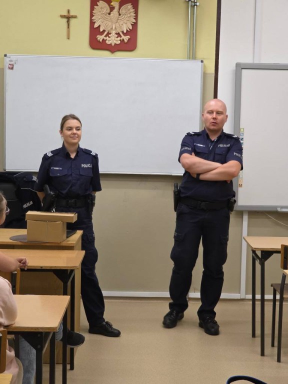Uczniowie uczestniczyli w szkoleniu prowadzonym przez przedstawicieli Komendy Powiatowej Policji w Chrzanowie P. Kingę Korbel i P. Grzegorza Martensa. Omówione zostały zasady zachowania się na drodze i w środowisku szkolnym oraz konsekwencje zachowań ryzykownych. Uczniowie rozwiązywali krzyżówkę związaną z zasadami ruchu drogowego oraz odpowiadali na wylosowane pytania dotyczące zasad bezpieczeństwa.