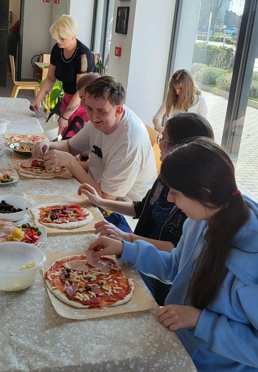 Uczniowie klas SPdP udali się do Chełmka. Celem wycieczki były warsztaty robienia pizzy w Cafe Kultura. Uczniowie samodzielnie przygotowywali ciasto na pizzę, wyrabiali je, a następnie układali na swoich pizzach ulubione dodatki. Zwieńczeniem pracy były pachnące i pyszne pizze, które uczniowie zjedli.
